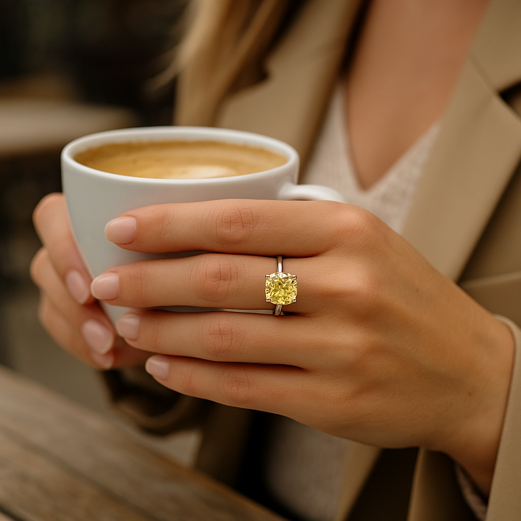 - Stone: Lab-grown diamond, Fancy Yellow (FVY)