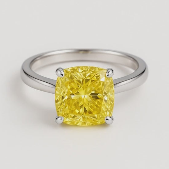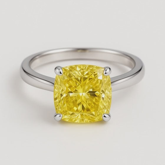 Elegant Fancy Yellow lab-grown diamond ring available in 2CT, 3CT and 5CT center stones, crafted in 18K white or yellow gold. Each ring features a vivid cushion-cut FVY lab diamond with VS1 clarity and a classic four-prong solitaire setting that maximizes sparkle.